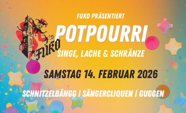 Unter dem Motto «Singe, Lache & Schränze» präsentiert das FUKO ein buntes «POTPOURRI» der hiesigen Sängercliquen und Guggenmusigen. Dabei wird das lokale Programm durch eine handvoll Basler Schnitzelbankgrössen vervollständigt. Man darf sich also auf eine spannende und unterhaltsame Mischung auf der Bühne freuen.