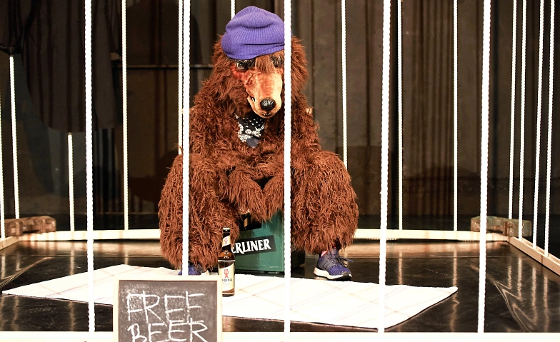 Was gibt es hier eigentlich zu sehen? Nichts besonderes. Nur einen Bären, der in seinem Käfig mittig auf der Bühne sitzt und das Publikum beobachtet, während das Publikum ihn beobachtet. Es ist schwer zu sagen, wer hier bestimmt was auf der Bühne und im Zuschauerraum geschieht - das Publikum, oder der Bär? Und warum denn eigentlich überhaupt der Bär?