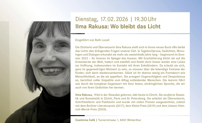 Ilma Rakusa: Wo bleibt das Licht Coalmine, Turnerstrasse 1, 8400 Winterthur Tickets