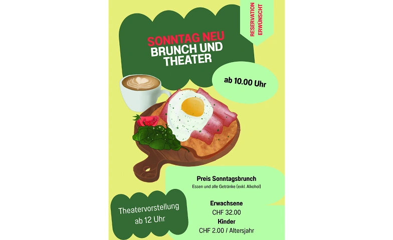 Ab dann verwöhnen wir Dich mit einem leckeren Sonntagsbrunch. Getränke (ausser Alkohol) und Essen ist alles im Preis inbegriffen. Eintritt Erwachsene = CHF 12.00, Brunch = CHF 32.00. Für Kinder liegt der Eintritt bei CHF 8.00 und für den Brunch zählt das Altersjahr x 2 (Beispiel: Ein Kind ist 6 Jahre alt, so liegt der Preis für den Brunch bei CHF 12.00, Total inkl. Eintritt CHF 20.00).
