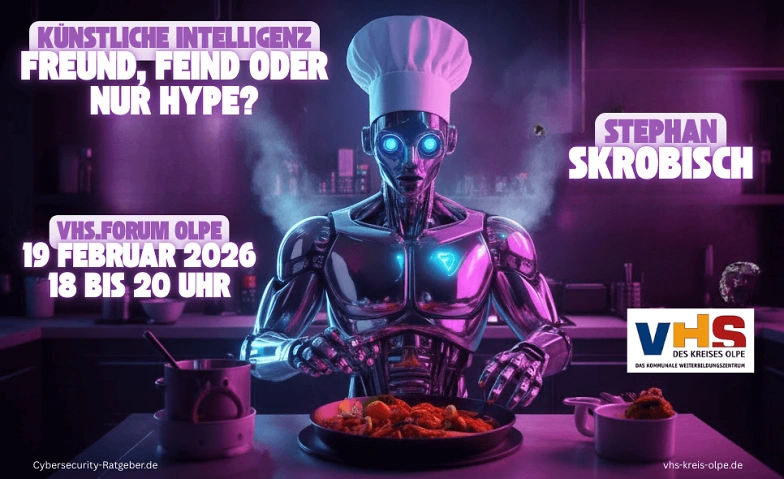 Tickets unter: https://www.vhs-kreis-olpe.de/kurssuche/kurs/Kuenstliche-Intelligenz-Freund-Feind-oder-nur-Hype/261-111016