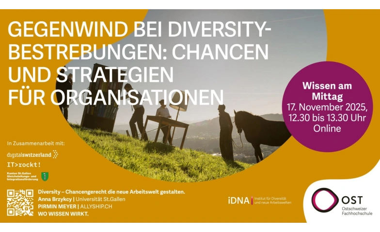 Die Online-Veranstaltungsreihe «Wissen am Mittag: Diversity – Chancengerecht die neue Arbeitswelt gestalten» wird vom iDNA Institut für Diversität und Neue Arbeitswelten angeboten. Fachpersonen und Organisationen sprechen zu Diversity-Aspekten und wie diese die Arbeitswelt beeinflussen.