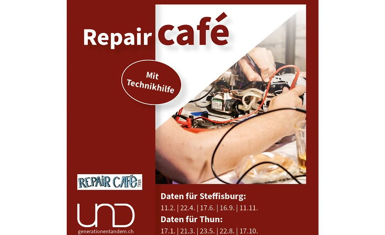 Im Begegnungszentrum von UND Generationentandem findet regelmässig ein Repair Café statt. Freiwillige des RepairCafé Steffisburg sowie Technikhelfer:innen von UND Generationentandem unterstützen dich dabei, defekte Gegenstände gemeinsam zu reparieren. Die Veranstaltungen fördern nachhaltiges Handeln, sparen Ressourcen und bieten Raum für Begegnungen bei Kaffee oder einem Getränk.