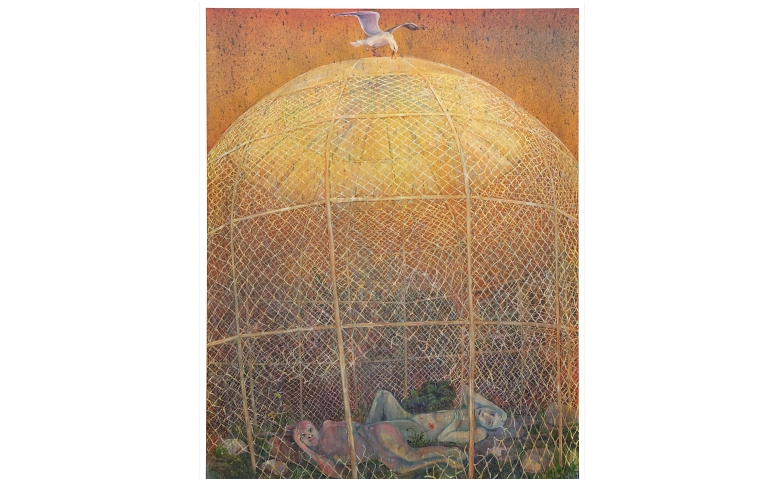 Credits: Andriu Deplazes, Körper im Schermen (Bodies in a shelter), 2025, Öl und Tinte auf Leinwand, 229 x 179 cm, Courtesy der Künstler und Galerie Peter Kilchmann, Zürich, Foto: Sebastian Schaub