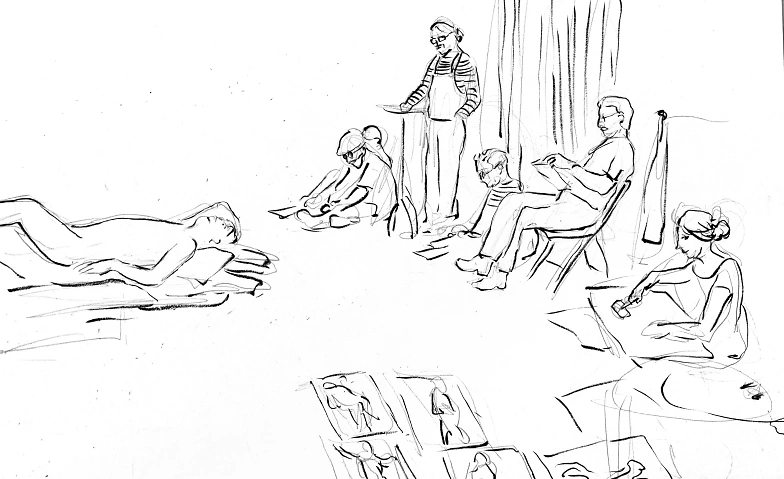 Since 2022, we’ve been hosting weekly life drawing sessions with a nude model, featuring both short and long poses. Each session begins with quick poses (2, 3, 5, and 15 minutes), followed by two longer 30-minute poses. Between each set, we take 5- to 10-minute breaks to relax, chat, and enjoy some tea and cookies.