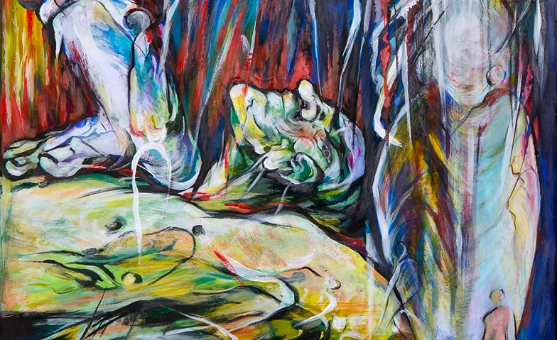 Credits: Mahbuba Maqsoodi, Satanssturz, Detail, 2019, Abtei St. Mauritius, Tholey, Acryl auf Papier, ca. 70 x 60 cm © Atelier Maqsoodi