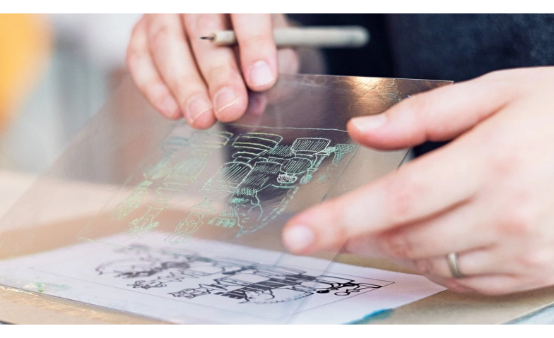 Im Workshopteil dreht sich alles um die Technik des Druckens. Wir üben uns in der Kaltnadelradierung auf Rhenalonplatten. Diese Kunststoffplatten können mit Radiernadeln nach selbstgezeichneten oder ausgedruckten Vorlagen bearbeitet werden. In einem zweiten Schritt wird das fertige Motiv eingefärbt und gedruckt. Die fertigen Drucke überzeugen durch ihre zarten Linien und aquarellhaften Farben.