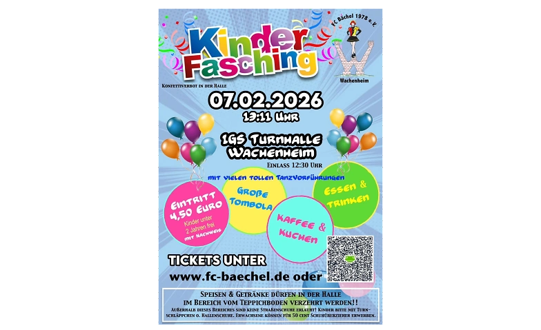 wir freuen uns, euch mitteilen zu können, dass auch im Jahr 2026 unser beliebter Kinderfasching in der IGS Turnhalle Wachenheim stattfinden wird! Seid dabei, wenn wir gemeinsam einen unvergesslichen Tag voller Spaß und bunter Kostüme erleben!