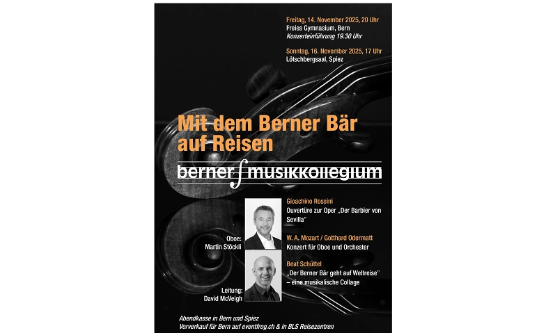 Das Berner Musikkollegium geht auf Weltreise. Diese beginnt mit einem Feuerwerk in Sevilla, mit Rossinis bekannter Ouvertüre. Weiter geht’s nach Salzburg, wo der junge Mozart ein Oboenkonzert komponieren wollte, es aber nach wenigen Takten schubladisierte. Der Schweizer Komponist Gotthard Odermatt hat sich diesem nun angenommen und es - im Sinne Mozarts - zu Ende komponiert. Jetzt geht die Reise weltweit, mit dem «Bärner Bär», einer musikalischen Collage von unserem langjährigen BMK-Mitglied Beat Schüttel. Wir sind gespannt, wo überall die Reise hingeht. Und: Findet der Bär wieder nach Hause zurück?