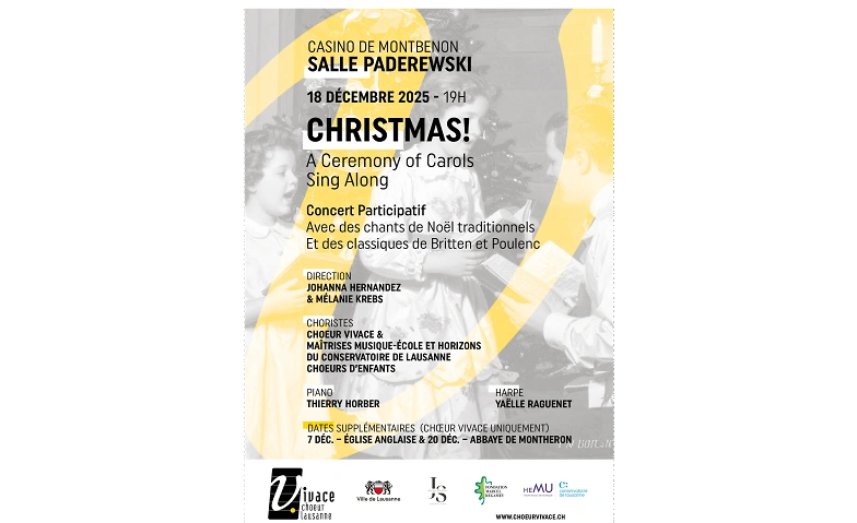 Le chœur Vivace se lance dans un nouveau projet, inspiré en particulier de la tradition sud et nord-américaine des chants de Noël et de la période festive de fin d’année. Il revisite le répertoire des Carols anglais ainsi que des chants de Noël américains et des classiques en français et italien, alternant styles anciens et jazz. Le chœur interprétera des chants profanes et religieux liés à cette période festive. Ils feront appel aux thèmes chers à cette période : paix, lumière, bienveillance. Pour le concert à la salle Paderewski, le chœur Vivace s’associe avec le chœur d'enfants de la maîtrise Horizon et Musique-Ecole du Conservatoire de Lausanne, dirigé par Mélanie Krebs nouvellement nommée directrice, avec ce répertoire qui concerne les enfants tout particulièrement. Yaëlle Raguenet de Saint-Albin, étudiante en première année de Bachelor instrumentiste à l'HEMU qui sponsorise généreusement l'artiste, nous accompagnera à la harpe. Le concert se veut interactif : le public est invité à chanter avec les choristes adultes et enfants avec pour objectif de faire découvrir l’art choral de manière ludique à un public de familles et d’engager des mélomanes curieux dans un moment de partage.