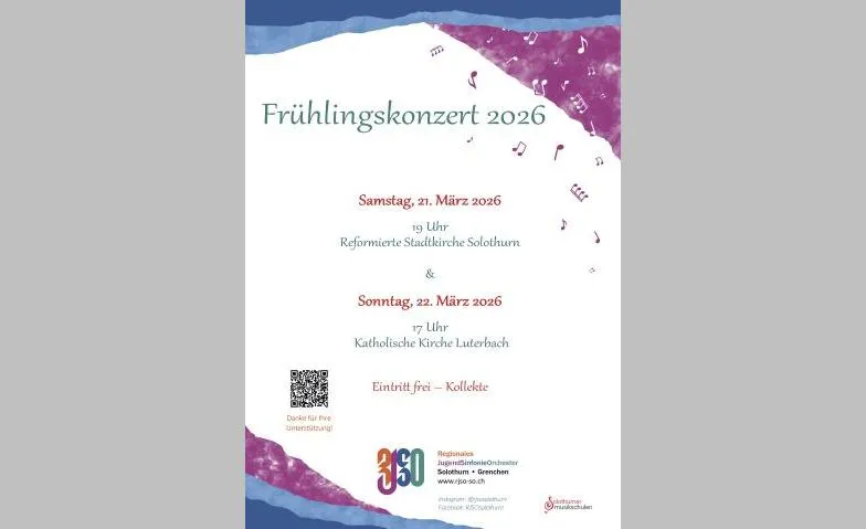 Franz Strauss, Horn-Konzert, Op. 8 Roger Quilter, Orchestersuite "Where the Rainbow ends" Gabriel Fauré, Elégie für Violoncello und Orchester Hans Zimmer, "Run Free & Homeland" aus "Spirit: Stallion of the Cimarron" Ensemble: Regionales Jugendsinfonieorchester Solothurn-Grenchen (RJSO) Leitung: Ruwen Kronenberg Solist: Christa Jutzi, Waldhorn Aleyna Noyan, Violoncello