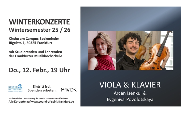 Donnerstag, 12.02., 19 Uhr, erklingt Kammermusik für Viola und Klavier in der Kirche am Campus Bockenheim, Jügelstr. 1, 60325 Frankfurt.  Zu Gast sind Arcan İsenkul (Viola) und Evgeniya Povolotskaya (Klavier).