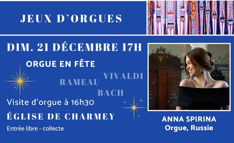 Le 21 décembre l'orgue de Charmey va briller dans la lumière de Noël sous les doigts de la talentueuse Anna Spirina. Venez savourer le programme festif et pétillant. Les œuvres de Noël de Bach, les transcriptions de la fameuse Gloria de Vivaldi et des airs d'opéra de Rameau vont faire ressortir toute la richesse sonore de l'orgue de Charmey !