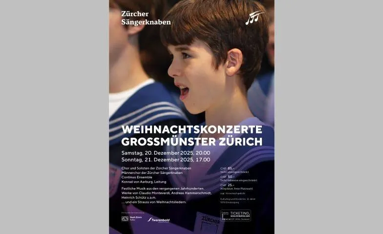 Festliche Musik aus den vergangenen Jahrhunderten. Werke von Claudio Monteverdi, Andreas Hammerschmidt, Heinrich Schütz, u.a.m. An den Weihnachtskonzerten 2025 im Grossmünster in Zürich präsentiert der Knaben- und Männerchor der Zürcher Sängerknaben und seine Solisten weihnachtliche Highlights der Chormusik aus vergangenen Jahrhunderten. Erleben Sie Doppelchörigkeit bis zu acht Stimmen, komponiert von Meistern wie Heinrich Schütz, Claudio Monteverdi und Andreas Hammerschmidt u.a.m.. Zudem wird ein Strauss von über Generationen überlieferten Liedern zum Fest das Publikum in harmonische Weihnachtsstimmung versetzen. Die Buben und jungen Männer freuen sich auf Sie! Ensemble: Zürcher Sängerknaben Leitung: Konrad von Aarburg Solist: Chor und Solisten der Zürcher Sängerknaben Männerchor der Zürcher Sängerknaben Continuo Ensemble Konrad von Aarburg Leitung