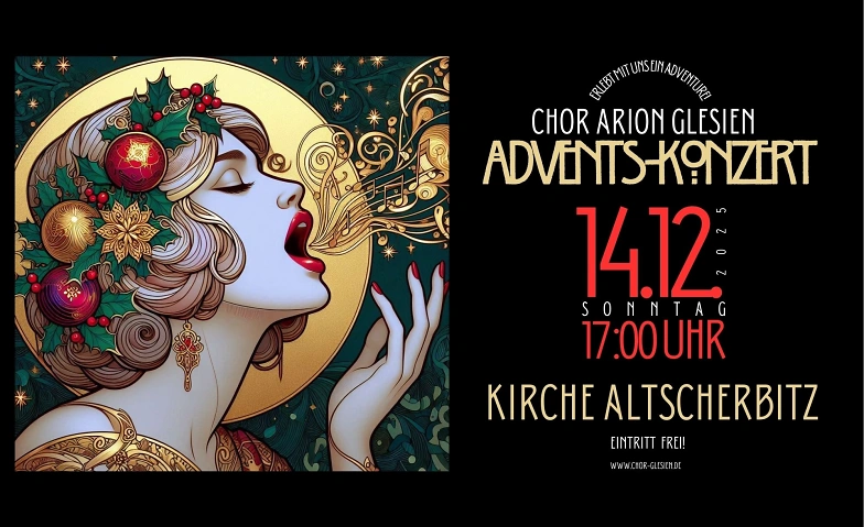 Der Chor Arion lädt ein zu einem besonderen Adventskonzert voller Wärme, Klang und Vorfreude. „Ein Leuchten im Advent – das Adventure geht weiter“, eine musikalische Reise durch besinnliche, berührende und mitreißende Werke, traditionelle Advents- und Weihnachtslieder in alten und neuen Chorarrangements – mal leise und besinnlich, mal kraftvoll und mitreißend. Ein Konzert, das Licht in die dunkle Jahreszeit bringt und den Advent auf besondere Weise erlebbar macht. Lassen Sie sich verzaubern und erleben Sie mit uns das nächste musikalische Abenteuer im Advent!