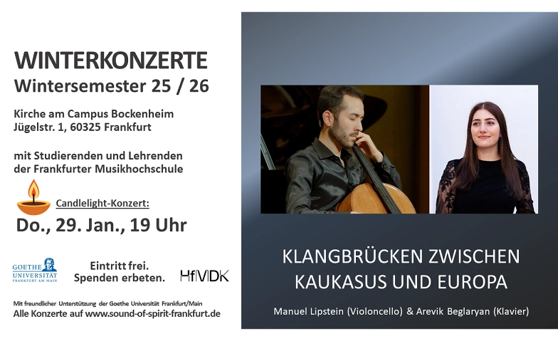 Do., 29. Januar, 19 Uhr, findet im Rahmen der Winterkonzerte 25/26 mit Studierenden der Frankfurter Musikhochschule ein Konzert bei Kerzenlicht in der Kirche am Campus Bockenheim, Jügelstraße 1, 60325 Frankfurt, mit dem Manuel Lipstein und der Pianistin Arevik Beglaryan statt.