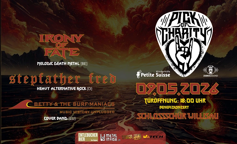Lass dich von Irony of Fate (BE) begeistern, die mit ihrem Melodic Death Metal und einem Sound, der richtig Wumms hat, europaweit Furore machen. Dazu gesellen sich Betty & The Surf-Maniacs (LU), eine der unterhaltsamsten Partybands der Schweiz, die mit Witz, Charme und Spielfreude jedes Publikum mitreisst. Den krönenden Abschluss liefert Stepfather Fred (DE, Allgäu), deren energiegeladener Heavy-Alternative-Sound und langjährige Bühnenerfahrung Festivals in ganz Mitteleuropa zum Beben bringen.