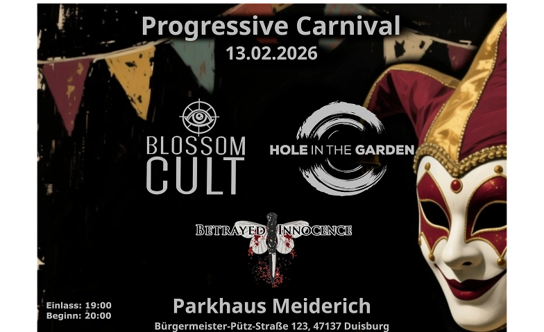 "Progressive Carnival" ist ein Konzert für die Kenner des hochwertigen Metal. Die Bands geben sich facettenreich von zart bis hart, stets virtuos und mit hohem Kreativpotential. Mit dabei sind Betrayed Innocence, Hole in the Garden und Blossom Cult.