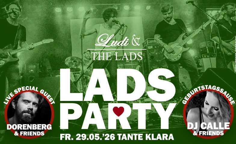 Nach 5 ausverkauften Berlin-Konzerten und ihrem gemeinsamen Auftritt mit Hugh Jackman und Kate Hudson endlich wieder live und in Farbe: LUDI & THE LADS bei der großen Geburtstagssause von DJ CALLE und DORI im Gartenlokal "Tante Klara" an der Bornholmer Str. - das wird ein Vergnügen! Denn wir feiern den Geburtstag von zwei unserer Herzensmenschen in einer ganz besonderen Location mit einem Feuerwerk an Hits zum Tanzen, Feiern, Froien!