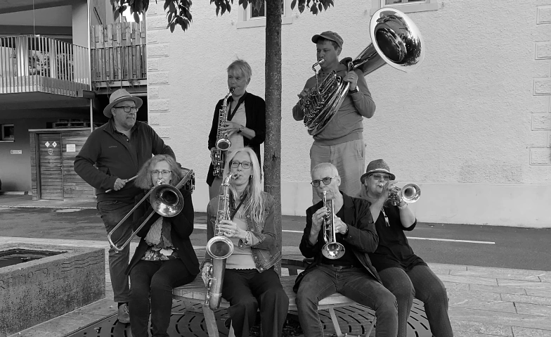 Los e-Moll besteht aus neun Musiker*innen, jung und alt. Alle eint die Leidenschaft für Strassenmusik.