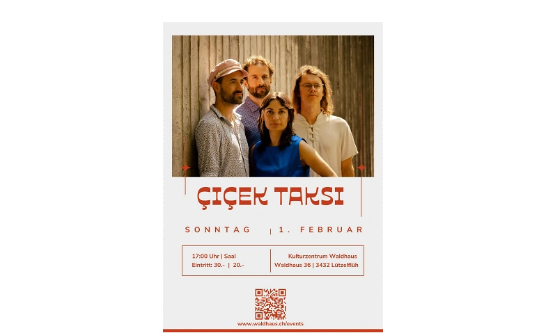 Çiçek Taksi widmet sich der Liebe zur Poesie — einer Liebe, die keine Sprachgrenzen kennt. Nebst Adaptionen anatolischer Lieder, mit denen die Sängerin der 2019 gegründeten Formation Çiçek Taksi aufgewachsen ist, spielt das Quartett eigenkomponierte Vertonungen türkischsprachiger Gedichte über Liebe, Widerstand und Hoffnung, geschrieben von Menschen aus der türkisch / kurdischen Community in der Schweiz. Mit Lyrik und akustischen Begleitinstrumenten erschafft das Quartett eine Stimmung, die sowohl die schwermütigen als auch die lebensfrohen Geister in einem zu erwecken vermag.