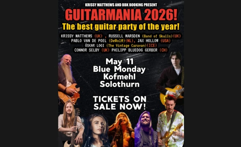 Die Tournee KRISSY MATTHEWS’ GUITARMANIA 2026 FEAT. RUSSELL MARSDEN (UK - BAND OF SKULLS), PABLO VAN DE POEL (NL-DEWOLFF), OSKAR LOGI (ISL - THE VINTAGE CARAVAN), JAX HOLLOW (USA), CONNOR SELBY (UK), und PHILIPP “PHIPU” GERBER (CH) findet statt vom 06. - 18. Mai 2026 und umfasst 13 Shows.