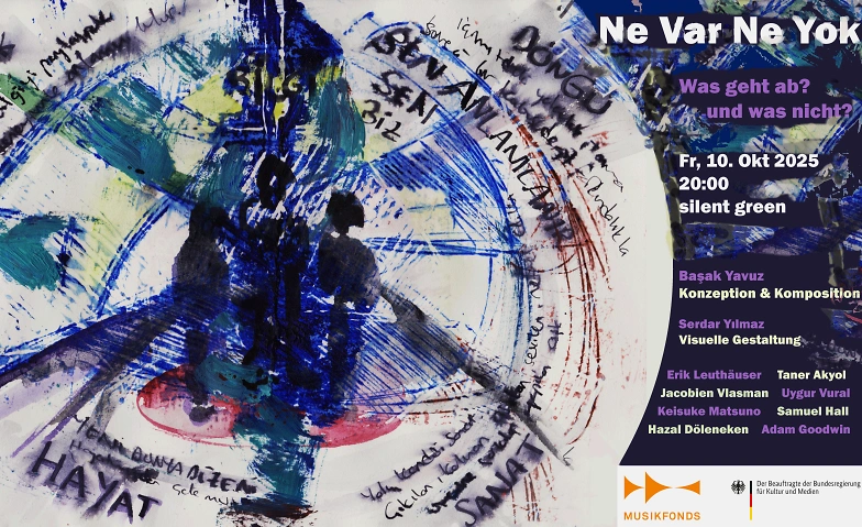 "Ne Var Ne Yok" - das ist Türkisch und steht für "Was geht ab? ...und was nicht?". Es ist eine Phrase geprägt von Doppeldeutigkeit und gleichzeitig auch der Name eines mehrsprachigen interdisziplinären Konzerterlebnisses, konzipiert, komponiert und dirigiert von Başak Yavuz, welches Musik mit einer visuellen und fiktionalen Welt vereint. Die zweite Bedeutung des Satzes ist "Weder hier noch dort" und eröffnet eine kommunikative Ebene, die einen Dialog über das Unbestimmte und den Zustand des Dazwischen ermöglicht. Die Performance entfaltet sich in einer allegorischen Welt zwischen den Ländern der Anwesenden und der Abwesenden und lädt das Publikum in einen Raum ein, in dem Grenzen verschwimmen, Bedeutungen sich wandeln und Erzählungen ineinander übergehen. Nach einer kollaborativen Kreativphase vereint die Performance dirigierte Improvisation mit Experimental Jazz und Spoken Word. Die Performance wird von einem Ensemble internationaler Künstler*innen aufgeführt. Mehr Infos