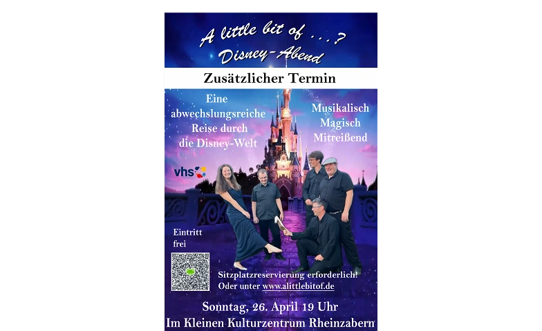 Am 26. April 2026 um 19:00 Uhr lädt die Band A little bit of ...? zu einem unvergesslichen Disneyabend im Kleinen Kulturzentrum Rheinzabern ein. Nach dem überwältigenden Erfolg des ersten Disneyabends im Jahr 2019 freuen wir uns, die Fortsetzung dieses magischen Abenteuers anzukündigen.