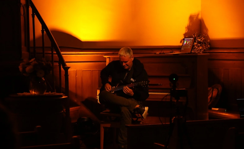 Tauche ein in einen Raum, in dem Musik und farbiges Licht verschmelzen. Während Hanspeter Krüsi spielt, umhüllt