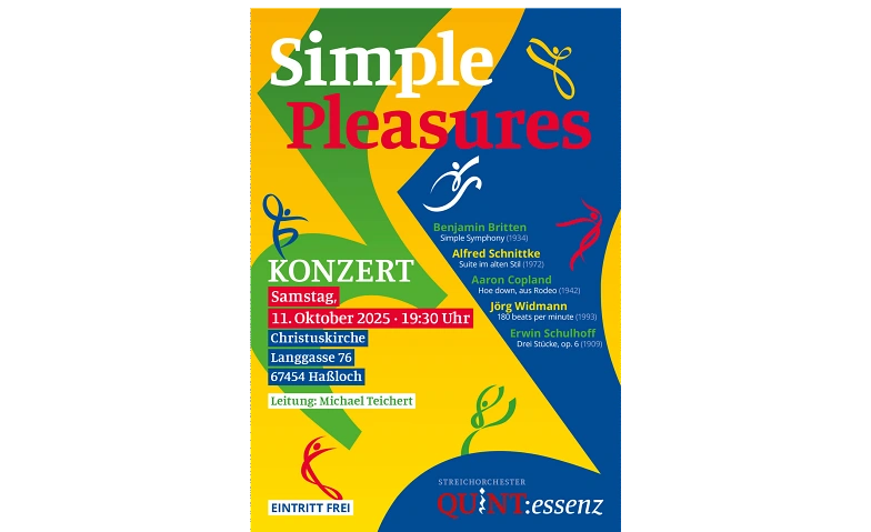 Das Kammerorchester Quint:essenz lädt zu einem abwechslungsreichen Programm voller Spielfreude ein, tänzerisch und unterhaltend, auf den ersten Blick einfach - und auf dem zweiten überraschend facettenreich und mitreißend. Das Konzert beginnt mit der bekannten aber immer wieder reizvollen „Simple Symphony“ von Benjamin Britten, simple ja, aber nicht trivial, das ist sie, die kleine Streichersymphonie. Darüber hinaus erklingen die „Suite im alten Stil“, d. h. in barocker Form von Alfred Schnittke, sowie 3 Stücke ebenfalls  im “alten Stil“ von Erwin Schulhoff. Simple Pleasures kann aber auch heißen, einen Volkstanz beim Rodeo („Hoe Down“ von Aaron Copland) musikalisch einzufangen oder einen Besuch auf einer Technoparty in Streicherbeats umzusetzen („180 beats per minute“ von Jörg Widmann).
