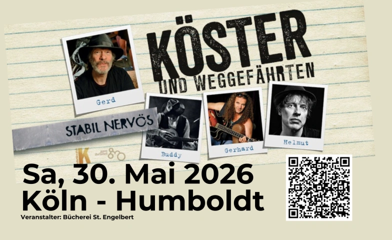 Nach ihrem ersten großartigen Konzert im Oktober 2024 in Humboldt, freuen wir uns erneut auf einen tollen Abend mit Gerd Köster und seinen langjährigen Weggefährten, den fantastischen Friesen Helmut Krumminga, und Buddy Sacher (ehemals Ars Vitalis) an den Gitarren, und Gerhard Sagemüller am Schlagzeug/Percussion.
