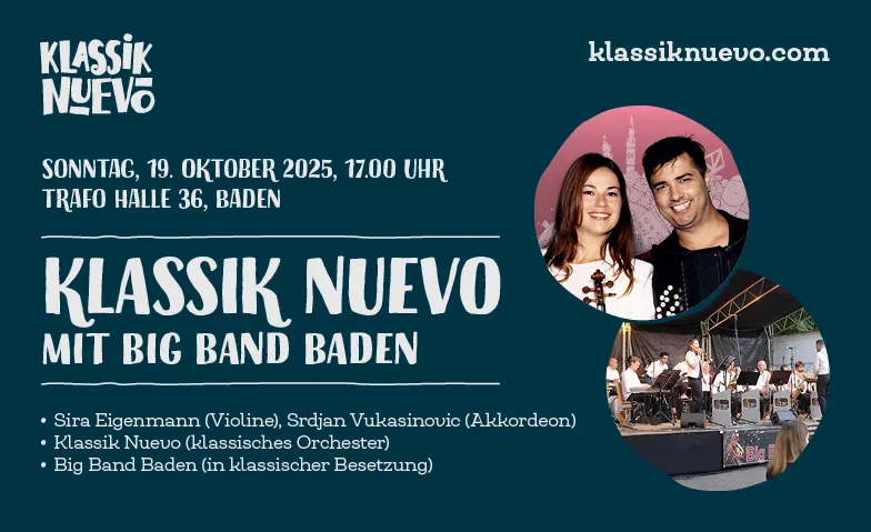 Bei diesem besonderen Konzert wird Klassik Nuevo von Big Band Baden begleitet. Die 1974 gegründete Band hat sich aus den Reihen der ABB Werksmusik entwickelt und besteht heute aus engagierten Amateurmusikern aus der Deutschschweiz und der angrenzenden deutschen Rheinseite. Unter der Leitung ihres musikalischen Leiters begeistert die Big Band Baden mit einem abwechslungsreichen Repertoire aus traditioneller und moderner Big-Band-Musik.
