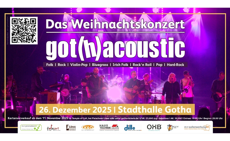 Got(h)acoustic, die sympathische und unterhaltsame Band aus Gotha, ist eine bunte Truppe talentierter Künstler, die aus verschiedenen musikalischen Projekten zusammengefunden haben. Die Band hat sich nicht nur in Gotha, sondern auch weit über die Stadtgrenzen hinaus einen Namen gemacht. Auf der Bühne erwartet das Publikum ein abwechslungsreiches Repertoire, das von Irish Folk bis Rock, von Pop bis Bluegrass und von Rock 'n Roll bis Hard Rock reicht – alles in einzigartigen Interpretationen dargeboten. Überraschungsmomente sind garantiert!