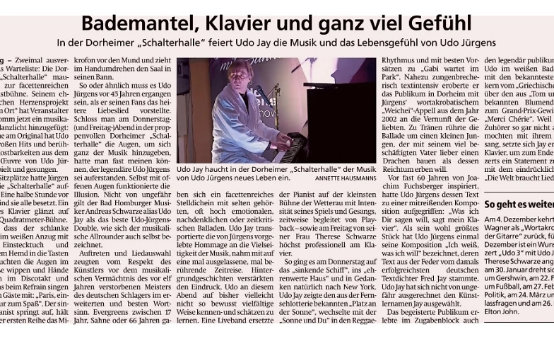 Spielt wie Udo - Singt wie Udo ... und sieht aus wie Udo. Udo Jay spielt und singt Udo Jürgens. Nach den grandiosen Erfolgen der ersten Konzerte nun ein weiteres Konzert in der Schalterhalle Dorheim, die innerhalb kürzester Zeit Kult geworden ist. Ein unvergesslicher Abend steht Ihnen bevor, zumal Therese Schwarze Udo am Klavier begleiten wird und natürlich auch mit ihm einige Stücke singt. "Ich wünsch dir Liebe ohne Leiden" ... und wir Dir viel Spaß!