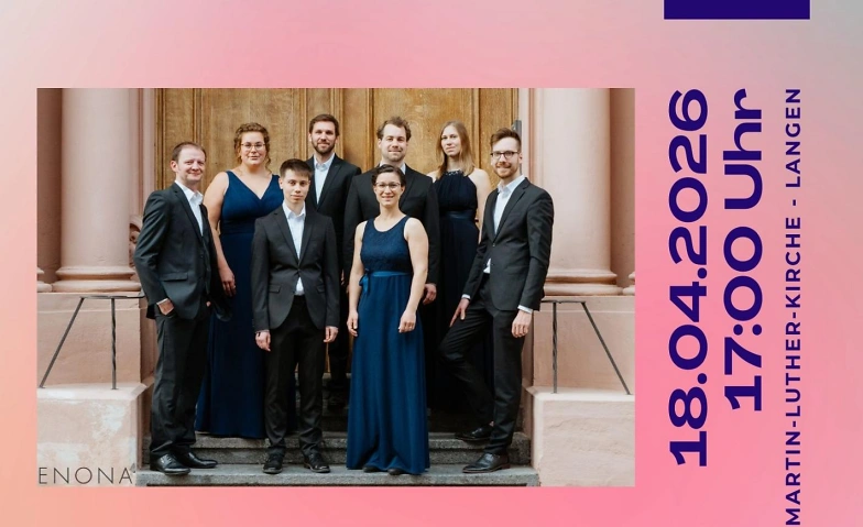 Am 18.04.26 um 17:00 Uhr gibt das Ensemble ENONA ein Konzert in der Martin-Luther-Kirche in Langen mit dem Titel Frühlingsahnung. Die Zuhörer erwartet Werke und Songs von Felix Mendelssohn-Bartholdy, Edward Elgar, Max Reger, Amy Beach und Sting.
