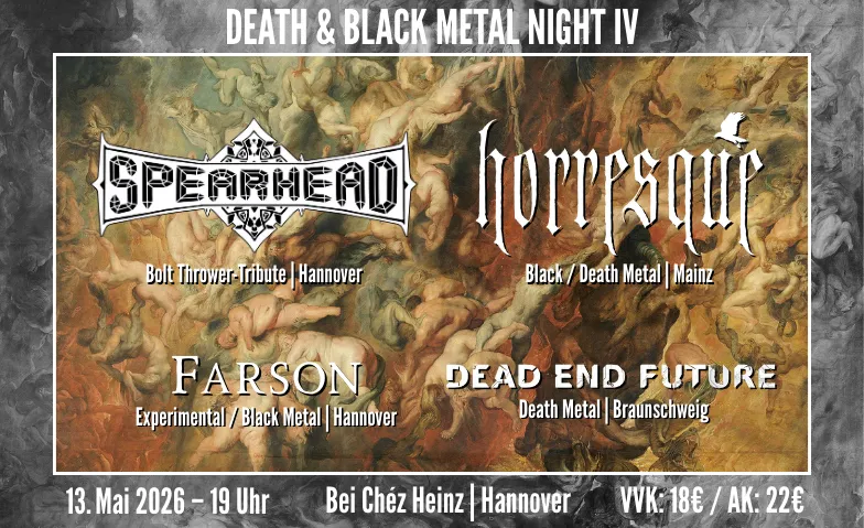 Am 13. Mai 2026 öffnet das Béi Chéz Heinz erneut seine Pforten zur vierten DEATH & BLACK METAL NIGHT. Einen Tag vor Himmelfahrt gehen wir demonstrativ den Weg in die Gegenrichtung und steigen mit HORRESQUE, SPEARHEAD, DEAD END FUTURE und FARSON musikalisch hinab ins Fegefeuer.