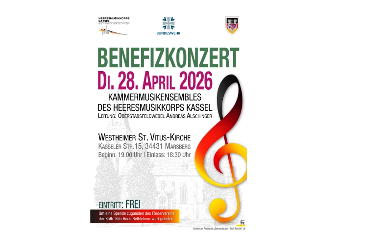Ein besonderes musikalisches Ereignis erwartet die Besucherinnen und Besucher am Dienstag, 28. April 2026, in der Westheimer St. Vitus Kirche: Ab 19:00 Uhr (Einlass ab 18:30 Uhr) gestalten verschiedene Kammermusikensembles des Heeresmusikkorps Kassel ein abwechslungsreiches Benefizkonzert.