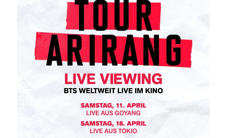 Die Pop-Royals BTS kehren mit ihrer mit Spannung erwarteten Welttournee auf die internationale Bühne zurück – ihre erste große Tournee seit etwa vier Jahren. Die Tournee umfasst 34 Städte weltweit mit insgesamt 82 Konzerten und beginnt mit wegweisenden Konzerten in Goyang (Südkorea) und Tokio (Japan). Verpassen nicht die Gelegenheit, zwei Konzerte in voller Länge live im Kino zusehen. Die Welt-Tournee von BTS mit dem Titel „ARIRANG” begleitet ihr fünftes Album in voller Länge, dass die Identität der Gruppe durch ehrliche Selbstreflexion und universelle Emotionen wie Sehnsucht und tiefe Liebe widerspiegelt, verwoben mit Musik, die sie auf ihre eigene Weise definiert. Mit einem spektakulären 360-Grad-Bühnenbild bietet die Show ein immersives Erlebnis, das das Publikum in den Mittelpunkt der Performance rückt. Erlebe gemeinsam die elektrisierenden Momente des kulturellen Comebacks von BTS auf der großen Leinwand weltweit, am 11. April aus Goyang und am 18. April aus Tokio.