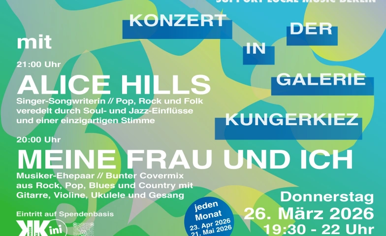 In Kooperation mit Support Local Music Berlin lädt die Galerie KungerKiez monatlich zu einem akustischen Abend mit talentierten Singer-/Songwriter*innen aus der Nachbarschaft und Berlin ein.