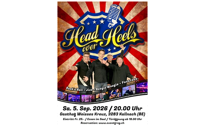 Head Over Heels bringen Boogie Woogie, Jive, Fox und Rock’n’Roll live auf die Bühne — Musik, die in die Beine geht und genauso gut einfach genossen werden kann.