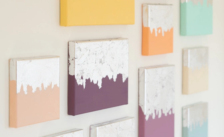 - Gestalte zwei Leinwände mit Akrylfarbe und Blattmetall in Deinem indidviduell ausgewählten Farbtönen und Blattmetall in Gold, Silber oder Kupfertönen