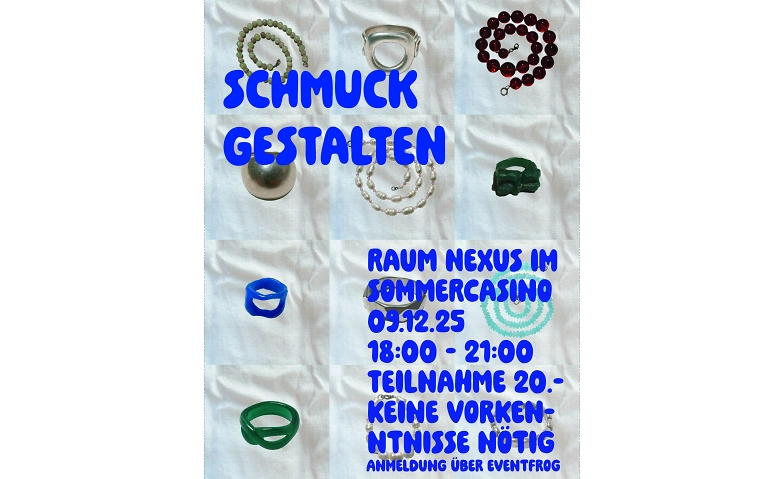 In diesem Workshop lernst du verschiedene Methoden kennen, mit denen du eigene Schmuckstücke gestalten kannst. Der Workshop ist in mehrere Stationen aufgebaut, die allen Teilnehmenden einen einfachen Zugang zur Schmuckgestaltung ermöglichen. Vorkenntnisse sind nicht nötig – nur Freude am Experimentieren und Ausprobieren.