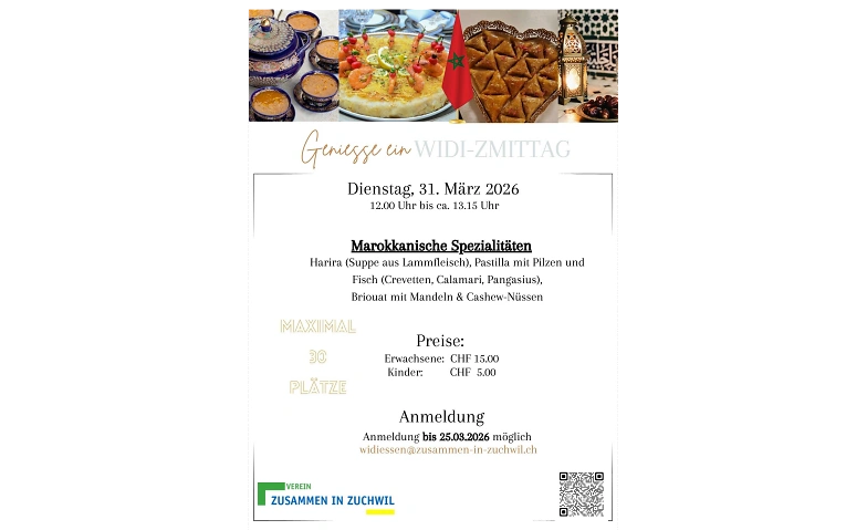 Der Verein ZUSAMMEN IN ZUCHWIL möchte mit dem Widi-Zmittag nicht nur das Potenzial von zugezogenen Menschen nutzen, sondern auch eine Plattform für Begegnungen schaffen. Eingeladen sind deshalb alle: Schweizerinnen und Schweizer, Zugezogene und Einheimische, Berufstätige und Nicht-Berufstätige, Kinder und Erwachsene.