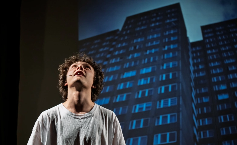 Die Uraufführung des Theaterstückes von Uta Bierbaum wird von Matthias Schönfeldt auf die Bühne gebracht. Er inszeniert Eddie als einen wissbegierigen und lebensfrohen Jungen, der sich und uns durch eine triste Hochhauslandschaft navigiert und die beklemmende Situation zu Hause mit Geschichten und Fantasie-Fahrstuhlfahrten zu vergessen versucht. Im Bühnenbild von Frida Grubba mit Dia-Projektionen und Diarahmen-Hochhauswelten entsteht ein facettenreiches Spiel zwischen Licht und Schatten, das durch die musikalischen Arrangements von Sinem Altan die turbulente innere Welt des Protagonisten klanglich übersetzt und seine Gefühle ans Licht des Tages bringt.