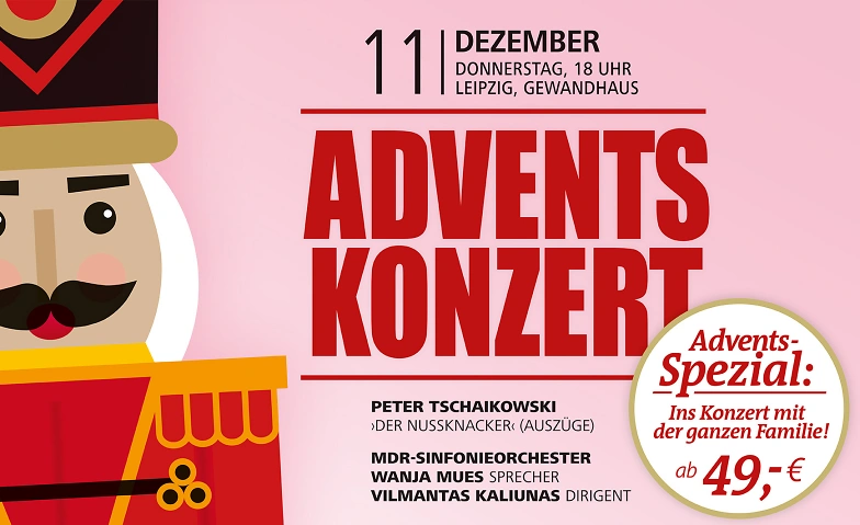 Tschaikowskis unsterblicher Nussknacker und Sandigs Weihnachtsklassiker "Sind die Lichter angezündet" – genießen Sie die MDR-Adventskonzerte am 11., 12. und 14. Dezember mit der ganzen Familie und sparen Sie dabei! Kinder zahlen nur 9 Euro pro Konzertbesuch. Bis zu zwei Erwachsene erhalten in Begleitung ihrer Kinder (bis 16 Jahre) den ermäßigten Eintrittspreis. Das "Advents-Spezial" ist nur im Paket und im Vorverkauf erhältlich.