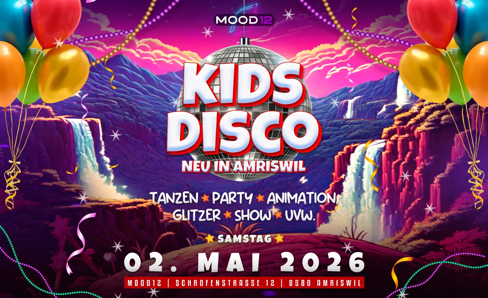 Am Samstag, 02. Mai, von 14:00 bis 18:00 Uhr verwandelt sich das Mood12 in Amriswil erneut in eine bunte Tanzwelt für kleine Partylöwen.