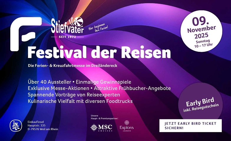 Am Sonntag, 9. November 2025, verwandelt sich das Einkaufszentrum Insel in Weil am Rhein von 10 bis 17 Uhr in ein Paradies für Reiselustige. Unter dem Motto „Die Welt zu Gast in Weil am Rhein“ lädt das traditionsreiche Familienunternehmen Reisebüro Stiefvater zur großen Ferien- und Kreuzfahrtmesse der Region – dem „Festival der Reisen 2025“ – ein.