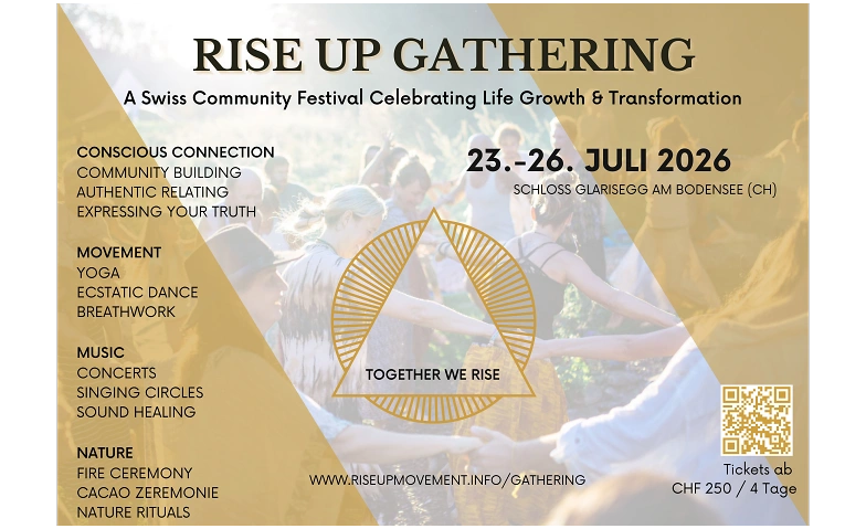 Das RISE UP GATHERING lädt dich ein, vom Donnerstag 23. Juli - Sonntag 26. Juli das Leben in all seinen Formen zu feiern und dich mittels kraftvollen Bewegungstechniken und transformierenden Übungspraktiken wie Yoga, Ecstatic Dance, Breathwork, Conscious Connection, Kakao und Feuer-Zeremonie und vielem mehr zu inspirieren.
