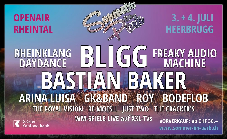 Dein Ticket für beide Tage am Sommer im Park – Openair Rheintal! Erlebe BLIGG, BASTIAN BAKER, Arina Luisa, Rheinklang-Daydance, Roy, Freaky Audio Machine, GK&Band, Just Two uvm. mitten in Heerbrugg!