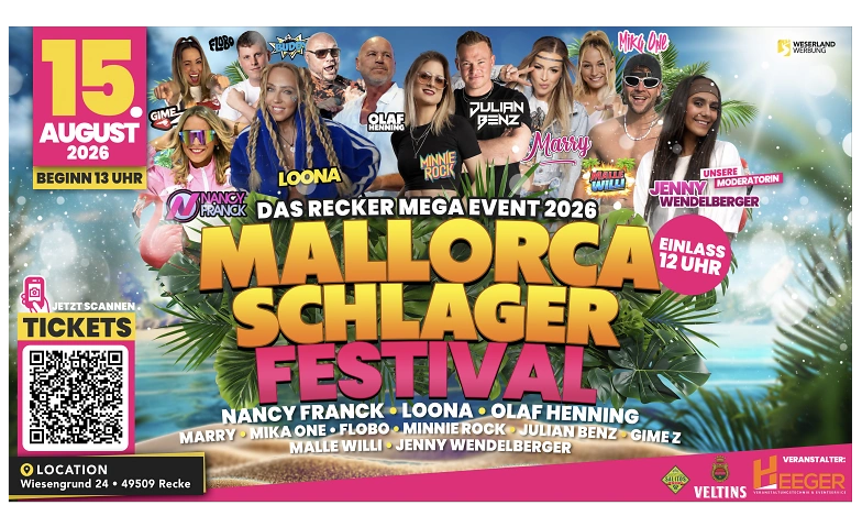 Das Mallorca Schlager Festival lädt zum großen Open-Air-Spektakel ein, Malle-Feeling pur, in lockerer, sonniger Atmosphäre. Mit Acts wie Loona, Nancy Franck, Julian Benz, Olaf Henning, Marry, Minnie Rock, Mika One, Buddy, Flobo, GIME Z wird ein abwechslungsreicher Mix aus Partyhits und Schlagermelodien geboten. Ideal für alle, die Stimmung, Mitsingen und gute Laune suchen.